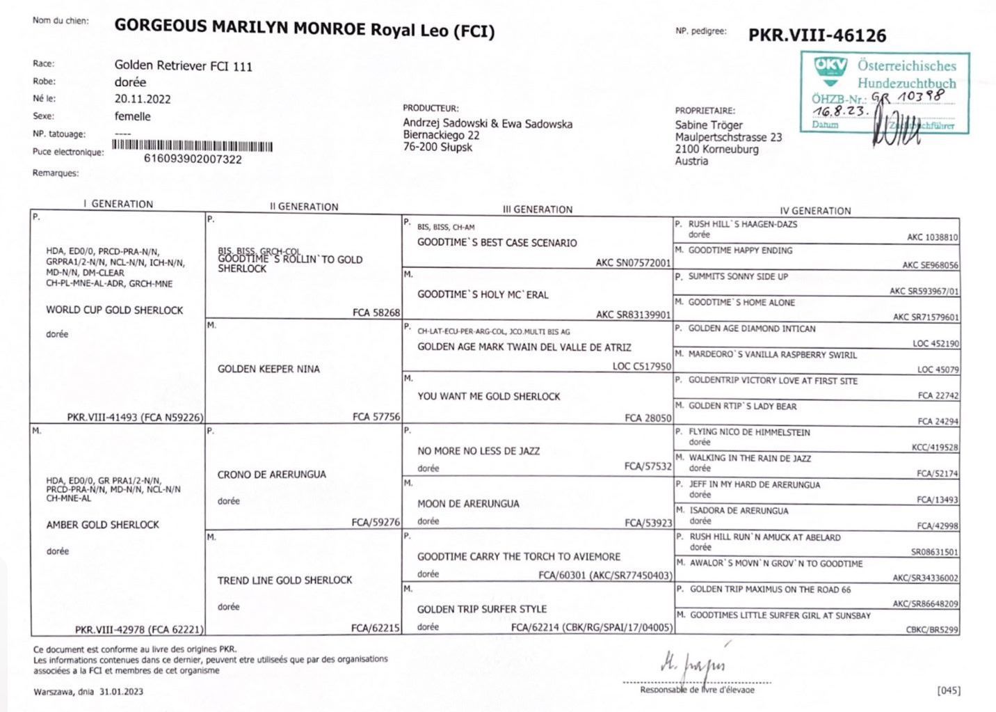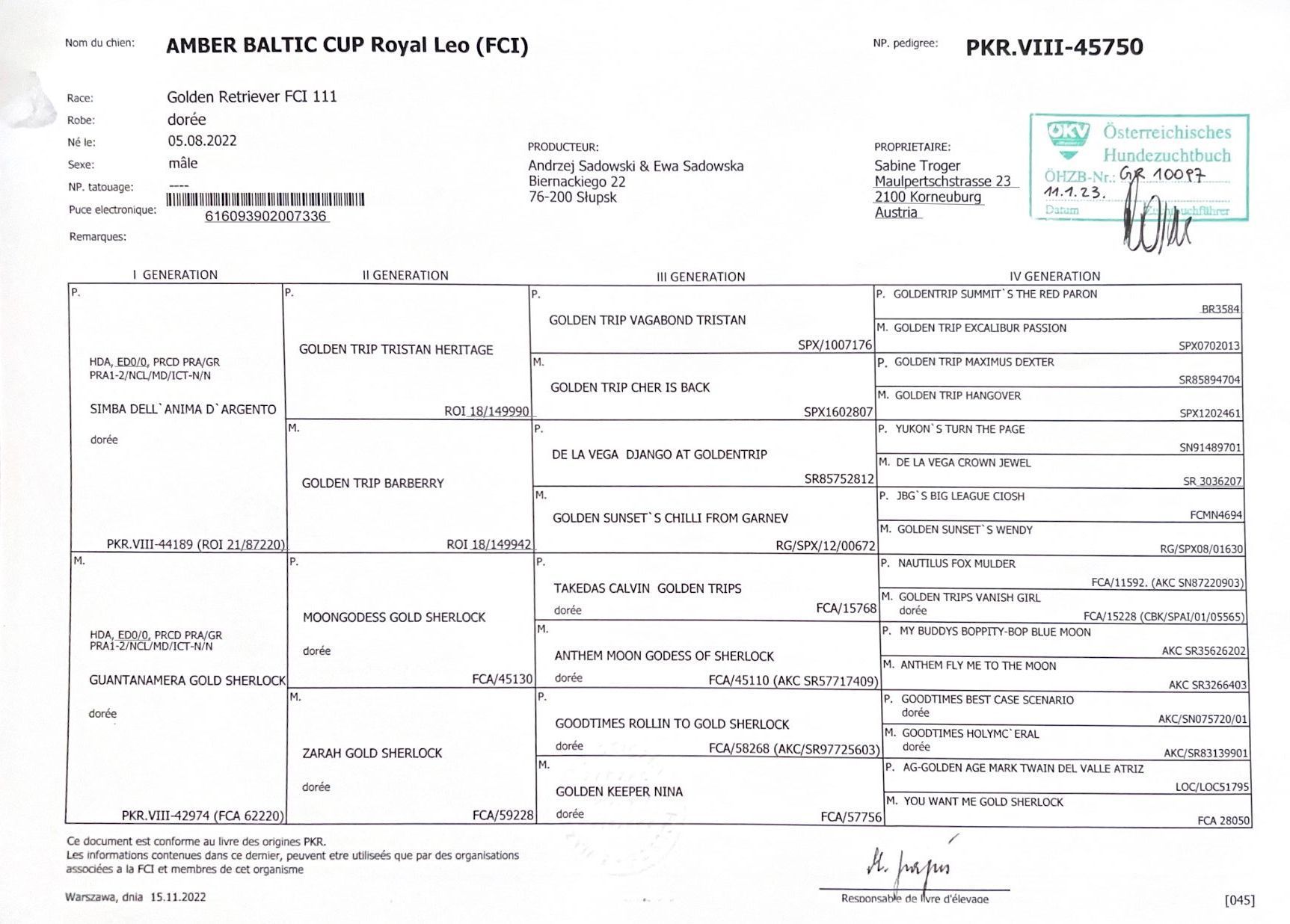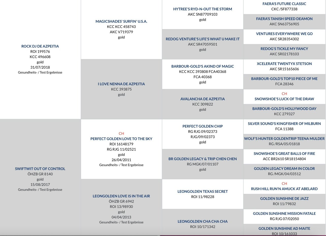 | Gesundheitsergebnisse | HD A, ED 0, OCD frei, GR_Pra 1+2 N/N, ICT N/N, prcd-PRA N/N, DM N/N, NCL N/N, OI N/N, MD N/N, MH N/N, Scherengebiss, Augen frei, zusätzlich. Gonioskopie frei |