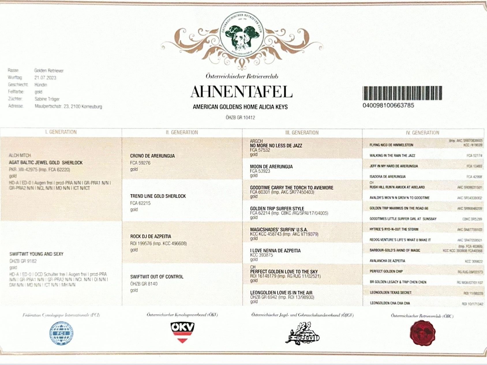 | Gesundheit | HD A, ED 0/OCD freiGR_Pra 1+2 N/N, ICT N/N, prcd-PRA N/N, DM N/N, NCL N/N, OI N/N, MD N/N, MH N/N, vollständiges Scherengebiss, Augen frei, zusätzlich. Gonioskopie frei |